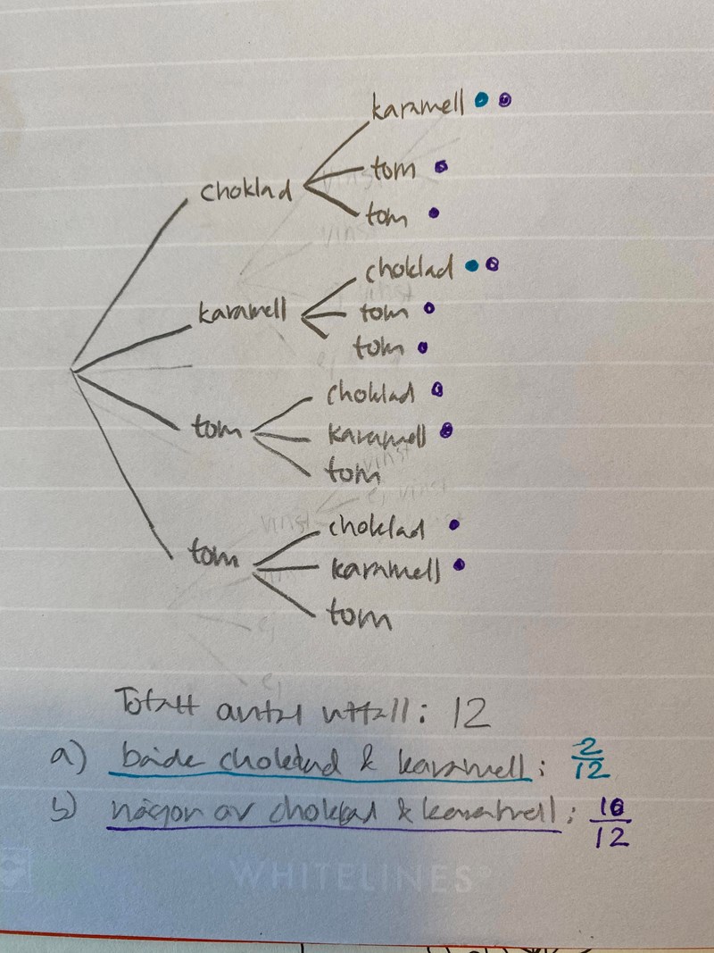 På b-uppgiften kan man också se det som att man undersöker komplementhändelsen: dvs. sannolikheten att man inte får något godis alls. Det är då 2/4 att den första lådan är tom och om så är fallet är det 1/3 att andra valda också är tom. 2/4*1/3=2/(4*3)= 2/12, vilket ger att komplementhändelsen är 1-2/12= 12/12-2/12= 10/12.