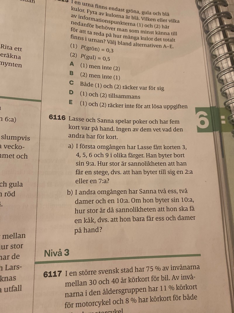 Lasse hade 5 kort. Det finns alltså 47 kort kvar (det spelar ingen roll att Sanna har några av dem, eftersom Lasse inte vet vilka kort hon har). Hur många av dessa kort är antingen en 2:a eller en 7:a?