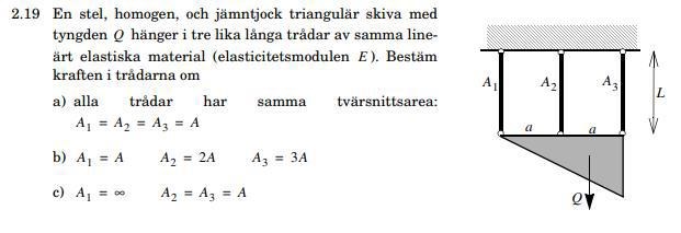 Ebola skrev:Som du ser i uppgiftsbeskrivningen så har de tre olika förhållanden mellan areorna du kan räkna med. Börja med a) där areorna är samma och se om din lösningsmetodik ger rätt svar. Detta kommer berätta för dig att du har rätt deformationssamband, jämviktsekvationer osv. Det är inte förrän i c) jag skulle påstå att det ens behövs ett generellt samband så som du sökte här.