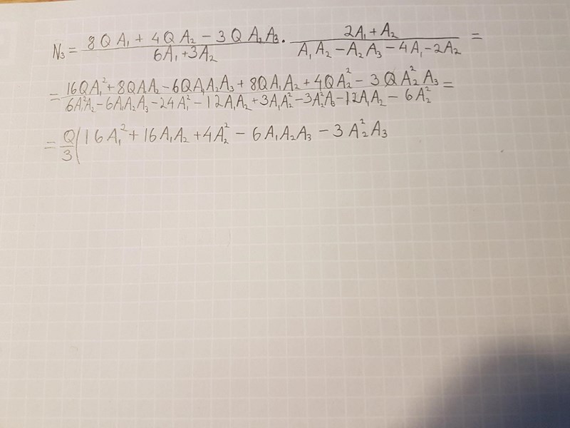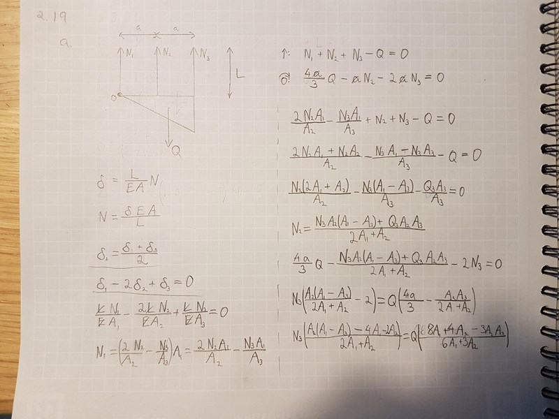 Smart! Insättning av A i ekvationen jag har längst ner till vänster i första bilden i samband med de två jämviktsekvationerna ger rätt värden på alla N. Detta bekräftar att deformationssambandet och jämviktsekvationerna är korrekta då eller hur? Blev dock fel i det komplicerade uttrycket för N3 alltså gjorde jag något algebraiskt fel.