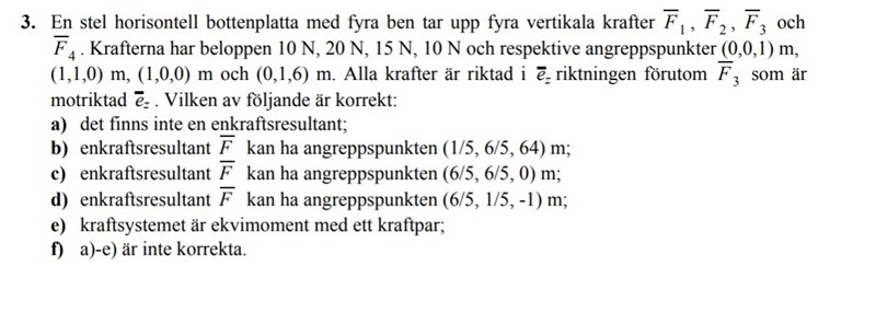 hej! Hur bör man tänka här? Förstår inte riktigt hur man får fram en enkraftsresultant. Jag vet att om F*M= 0 och F skiljer sig från 0 så kan den reduceras till en enkraftsresultant, men då måste väl M=0. Hur löser jag detta?