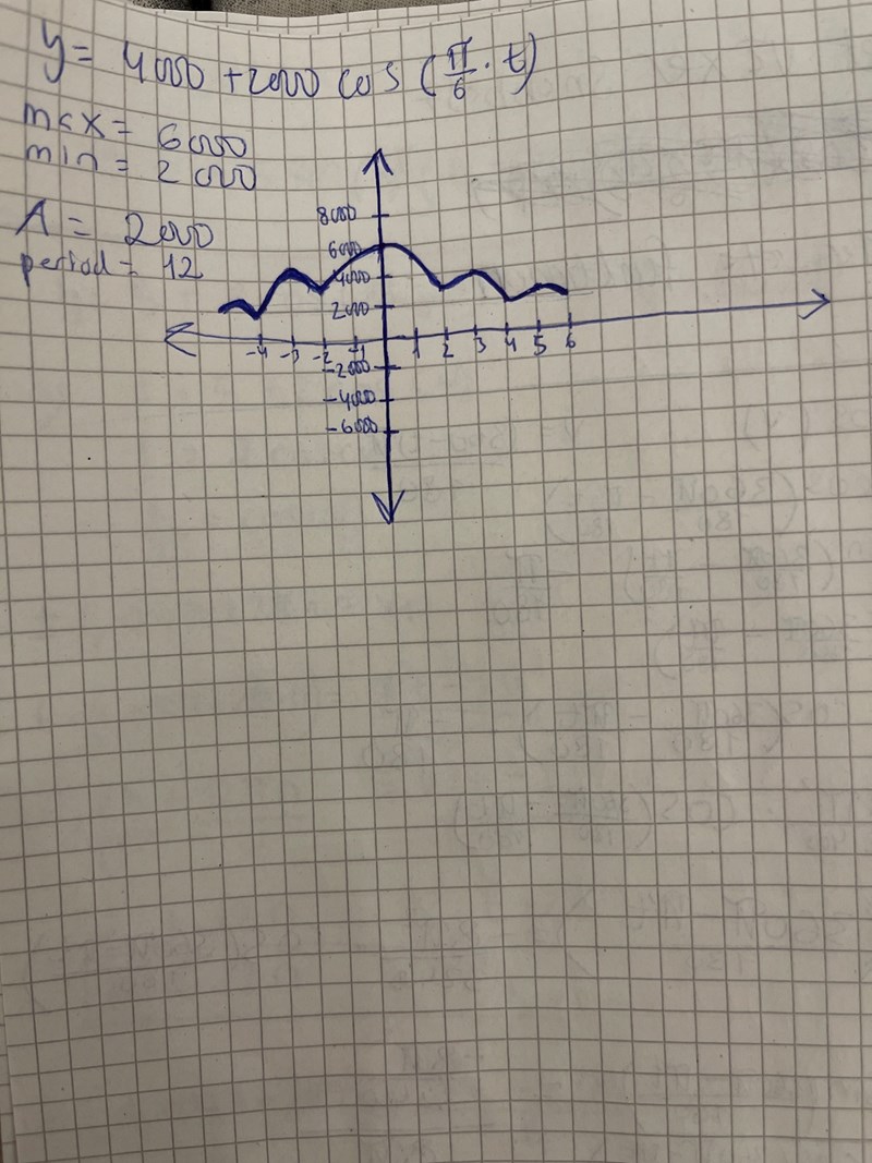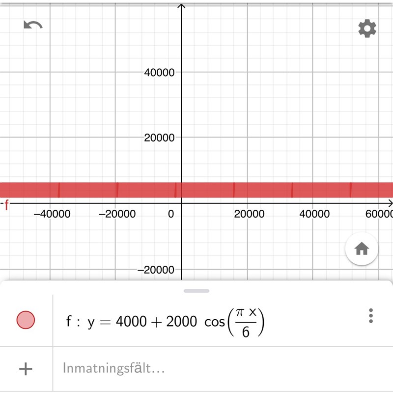 Kurvan ska gå upp och ner, ja, men den ska gå mellan samma extremvärden hela tiden, som cosinuskurvor brukar göra. Din kurva verkar falla.