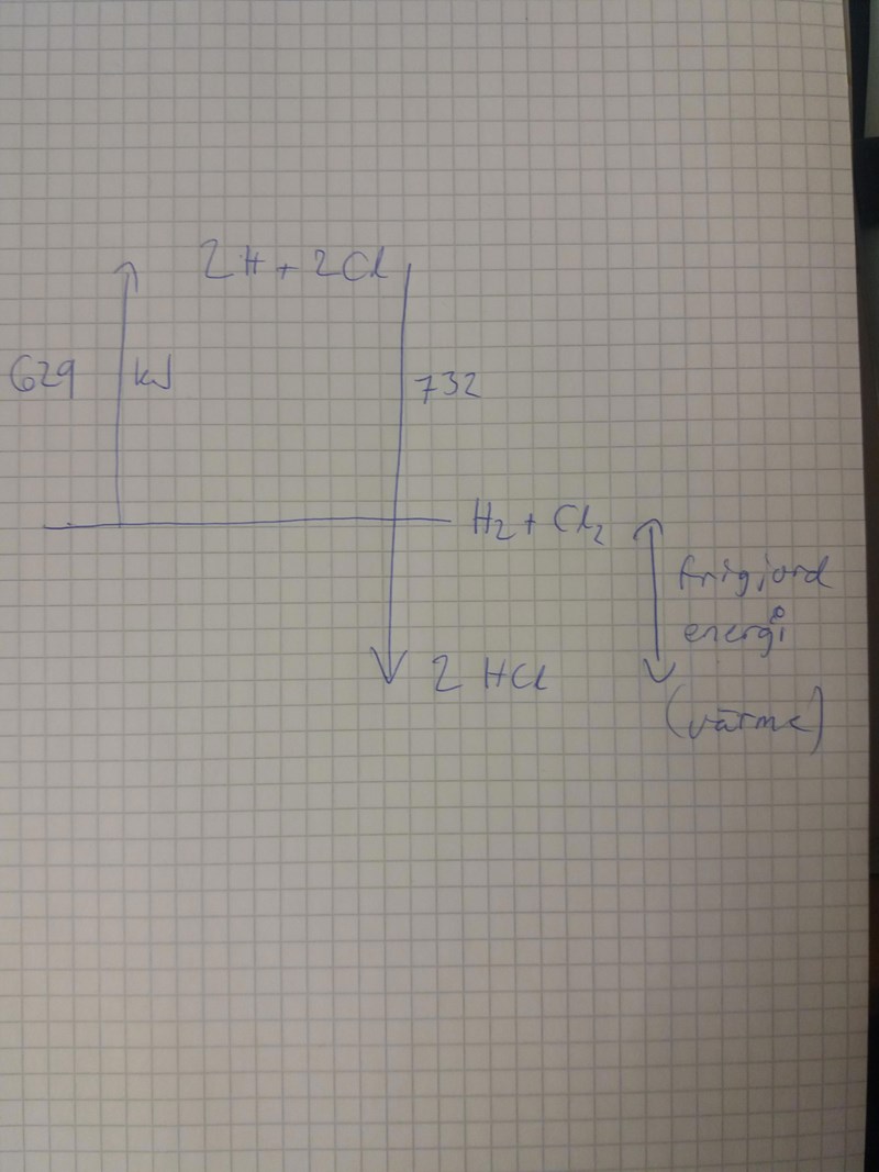 Om du vet entalpivärdena före och efter så kan du räkna ungefär så som jag tror att du tänker: Bindningsentalpin är 0 från början (eftersom det är grundämnen som reagerar), vi tillför 629 kJ och tar bort 732 kJ då blir bildningsentalpin för 2 mol HCl 629-732 = -103 kJ. -103 kJ - 0 kJ = -103 kJ.