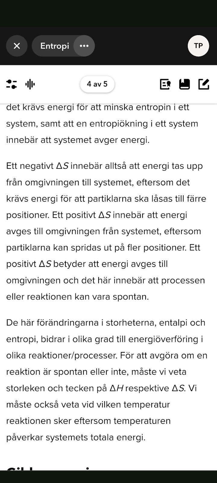 Negativt ΔS betyder att systemets entropi minskar, dvs värme avges från systemet. I boken står det tvärt om.