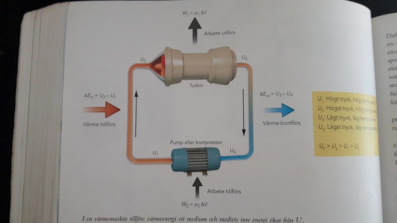Dock så säger boken, om entropi, helt andra saker. I värmemaskinen så tillförs värme för att sedan efter expandering bortföras för att sedan komprimeras.