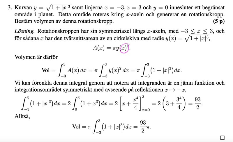 Jag tänker att pi*r^2 = area på cirkeln. Och genom uppritning får jag att r=y. För att få volymen så tar vi * dx som är bredden på varje skiva. Sedan för att få hela rotationsvolymen tar jag integralen av -3 till 3.