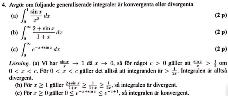 Om man vill kan man sedan som facit gå vidare och göra f(x) än mindre, åtminstone på intervallet . Men man kan också direkt räkna ut den nya integralen och visa att den blir divergent. Använd substitutionen