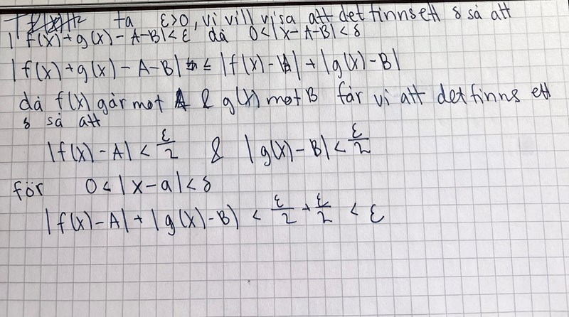 Hej, detta är mitt försök att bevisa f(x)+g(x)→A+B, då x→a. Jag undrar om det är tillräckligt (antar att det inte är det) & undrar hur jag skulle kunna förbättra det.