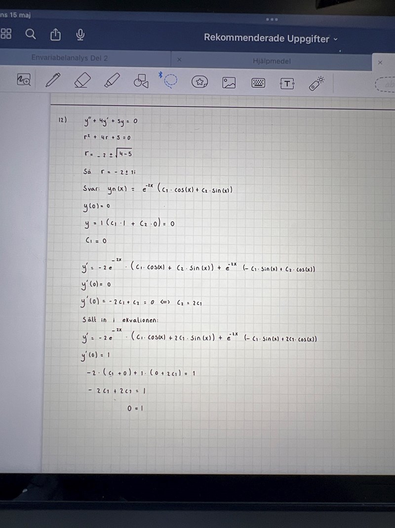 Av någon anledning skriver du att y'(0)=0 men i uppgiften står det att y'(0)=1. Stryk dina beräkningar där du använder det felaktiga randvillkoret så hamnar du säkert rätt. Det ser fint ut i övrigt!