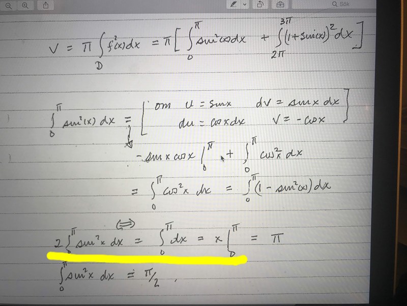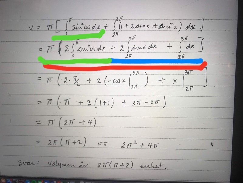 Hej, på denna fråga förstår jag inte det gula och blåa understrukna. Det gula understrukna: Jag förstår inte hur 2sin^2(x)=1. Det röda understrukna: Jag förstår inte hur uttrycket högst upp på bilden kan skrivas om till det blåa. Hur är de gröna understrukna lika med varandra? Och hur har det blåa skrivits om?