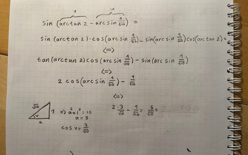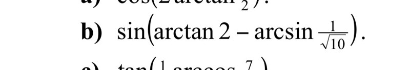 Envariabelsanalys. Beräkna sin(arctan 2 - arcsin 1/sqrt(10))