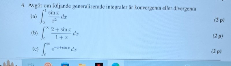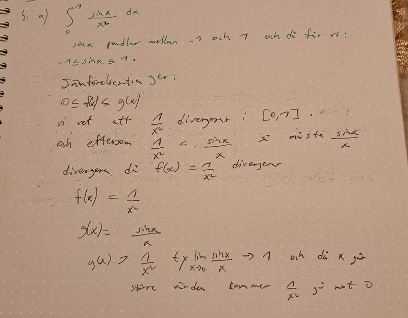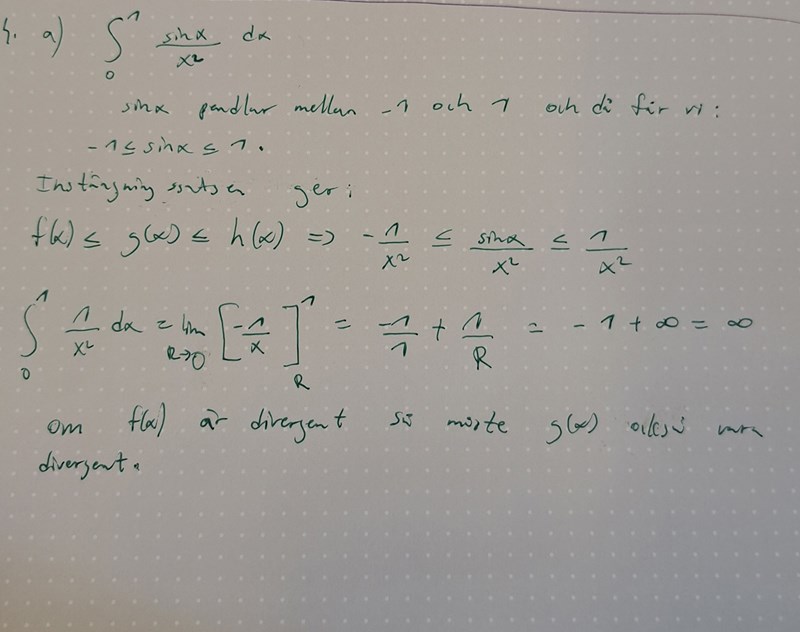 Calle_K skrev:Fel av mig, inte 1/x^2 men k/x^2 där k är såpass litet att k/x^2 < sinx/x^2 integrerat över intervallet 0 till 1 (detta måste visas).