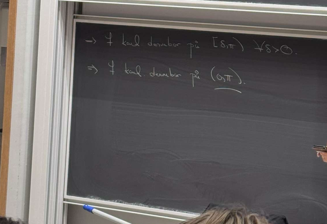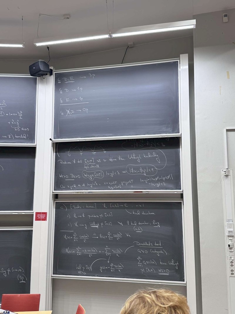 På bilden, alldeles ovan för hjässan med blonda håret står hans slutsats: konvergerar likformigt på halvöppna intervallet delta<=x< pi, vilket är korrekt. Alltså inte det öppna intervallet (0,pi). Notera att likformig konv på kompakta delmängder av en mängd A medför punktvis konv på hela A. Detta följer helt enkelt av att varje punkt är kompakt.