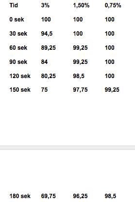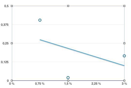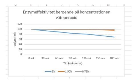 Hej, nu behöver jag hjälp med den andra grafen. Här handlar det om att jag har olika koncentration av väteperoxid som är substratet; 0,75%, 1,5% och 3%. Jag gjorde precis som i förra inlägget och jag fick fram reaktionshastigheterna. Jag antar att jag ska ha substratkoncentrationen på x-axeln nu. Men jag fattar inte hur jag ska få fram det i siffror...