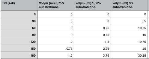 Det var så att vi skulle dela våra mätvärden med två andra som då hade som uppgift att variera substratkoncentrationen men ha konstant enzymmängd. Jag och min labbpartner hade olika mängd enzym men konstant substratkoncentration. Men jag kan stämma med dem och se hur de har tänkt så återkommer jag.