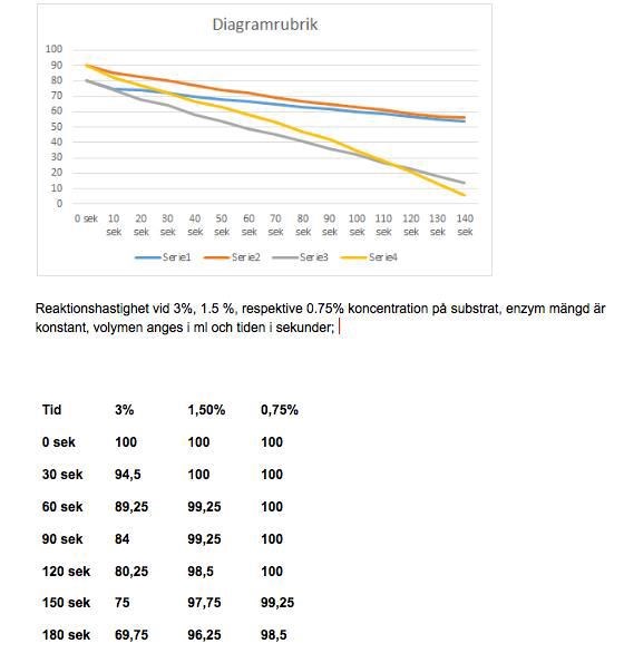 Jag tycker att mätvärdena är väldigt konstiga. Din graf ser rätt ut, fast du borde inte ha satt ditt en linjär trendlinje. I det här fallet vet vi att kurvan måste skära origo eftersom man inte kan ha någon reaktion utan substrat. Då får man en trend som visar på ökande reaktionshastighet med ökande substratkoncentration. Det är också vad dina tabellvärden visar, för man får en betydligt snabbare reaktion vid 3 % jämfört med vid 1.5 och 0.75 %. Reaktionen känns nästan orimligt snabb vid 3 %. Är du säker på att mätvärdena är korrekt inskrivna? Vad menar du med "deras tabell"?