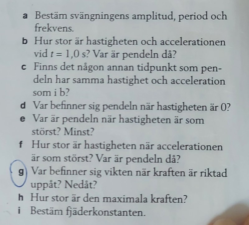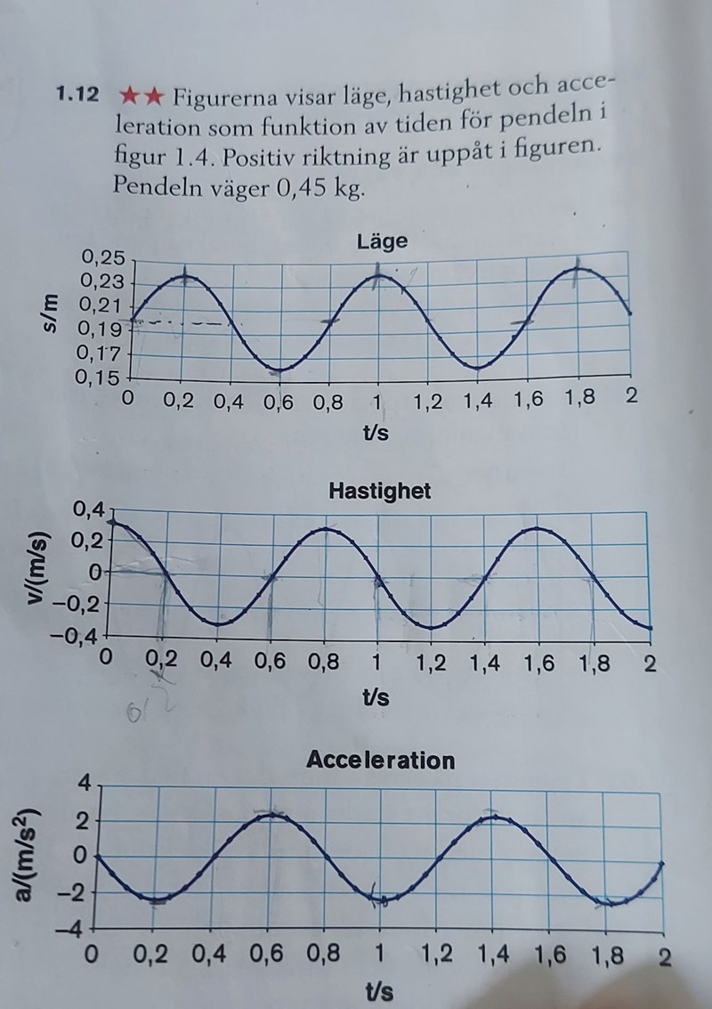 Vilket läge har pendeln när t = 0? När har den samma värde igen (och är på väg åt samma håll)? Där har du perioden. Du kan lika gärna läsa av skillnaden i tid mellan två högsta-lägen (men den skillnaden är inte 1 s).