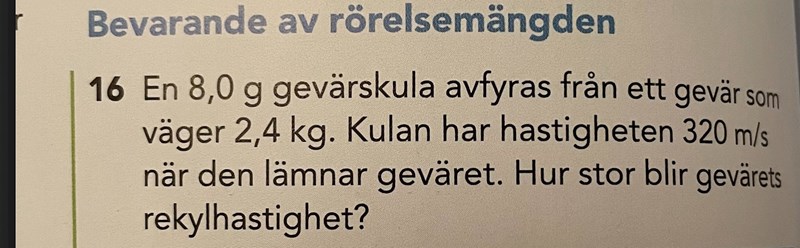 Om kulan väger 8.0g, geväret 2.4kg, den lämnar geväret med 320m/s.