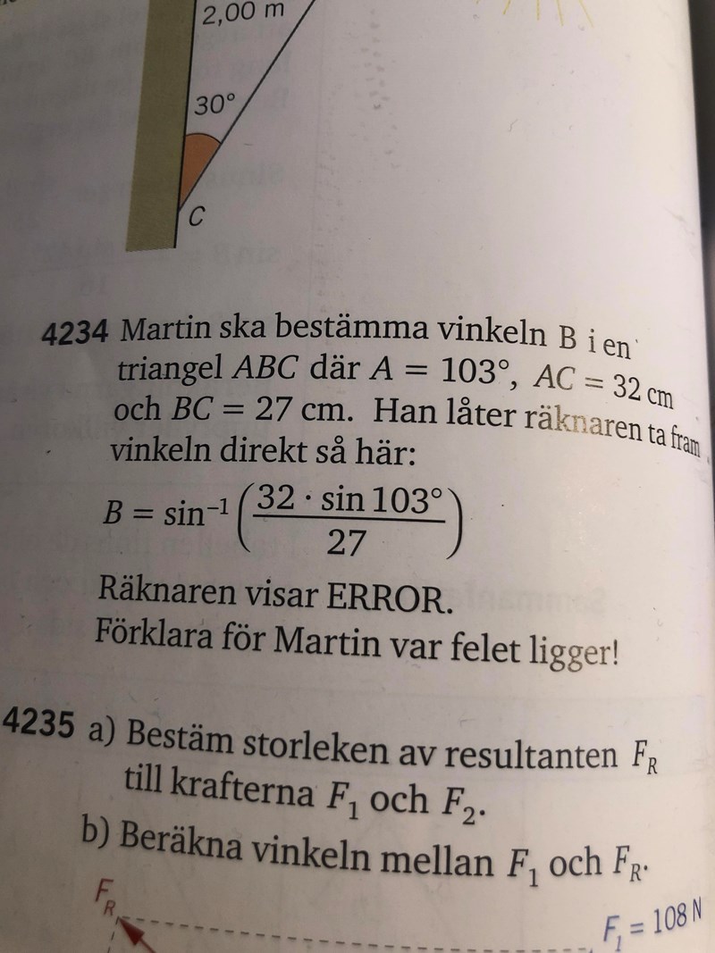 På 4234 så får man error på räknaren. När jag slår sin (32*sin 103)/(27) så får jag 1,15 och om man ska utgå från enhetscirkeln så är det maximala 1 vilket gör att vi befinner oss utanför 1 och inga svar/vinkel finns?