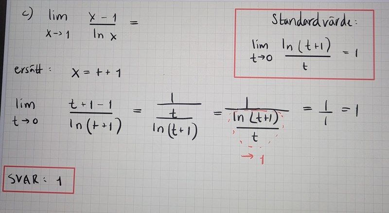 Nästan, jag skulle skrivit [ln((t+1)] / t i tredje ledet från slutet. Du har bara vänt på nämnaren, det ger samma svar men är inte enligt boken.