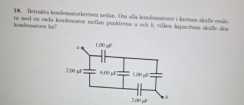 Nu: räkna ut ersättningskapacitansen då!Okej så man kan kortsluta kapacitansen i mitten och räkna på de övriga?