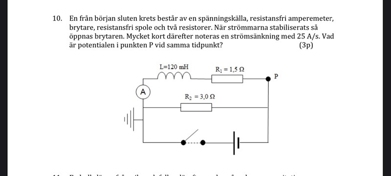 Men utifrån beräkningen kan man gissa sig till att man bryter upp strömbrytaren och ska beräkna potentialen i P i samma ögonblick.