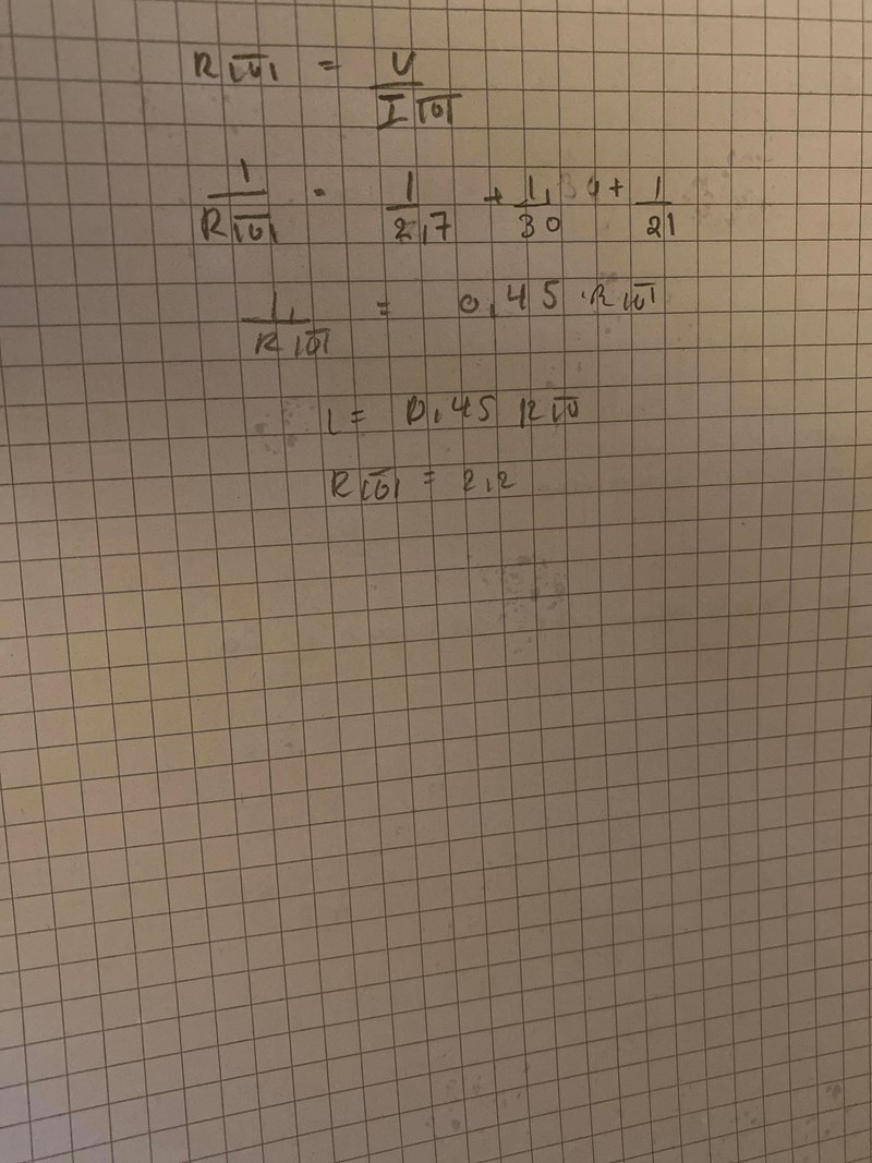 Pelle skrev:Eftersom du vet totala strömmen i kretsen kan du med Ohms lag beräkna totala