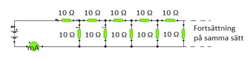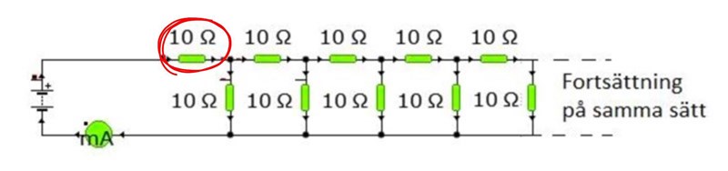 Då kretsen fortsätter oändligt långt till höger bör resistansen bli oförändrad om man förlänger kretsen ett steg till åt vänster. Vi säger att resistansen i kretsen är R. Lägger man till två två motstånd i början av kretsen (vänster) ska kretsen fortfarande ha resistansen R. De två motstånden som läggs till är på 10 ohm. Vi får alltså 10 ohm i serie och 10 ohm parallellt med R. Vilket ger formeln