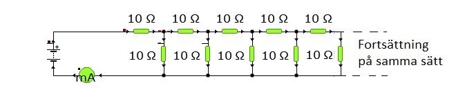 1/50+1/10+1/10+1/10+1/10+1/10= invers 50/26= 1,9 ohm. Men kretsen ska ju fortsätta i "oändligheten", jag har räknat olika antal serie och parallellkopplingar för att se något samband men inget so far, känns som att jag är långt bort och cyklar.