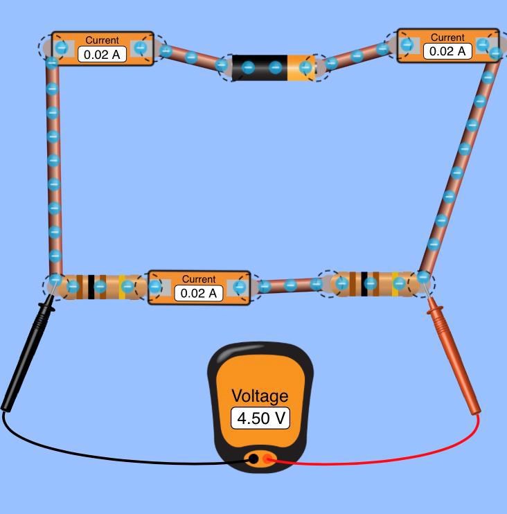 Krets med två motstånd (båda på 100 ohm) och strömkällan (4,5 V) i serie.