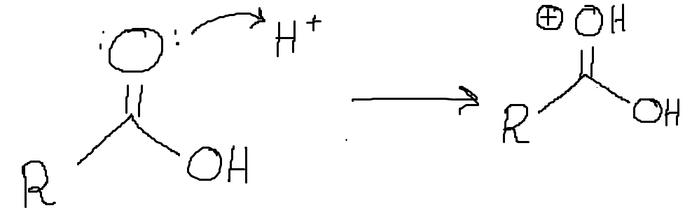 I det första steget under den katalyserade esterbildningen så norpar ett fritt elektronpar på karbonylsyret i karboxylgruppen en proton. Denna ger karboxylgruppen större karbokatjonkaraktär och gör karbonylkolet mer elektrofilt. Detta påskyndar attacken från alkoholens OH-grupp: