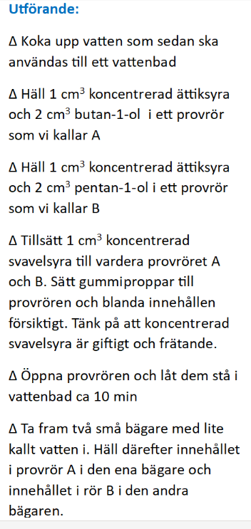 Jag förstår fortfarande inte varför man skulle få en röd färg. Både pentyl- och butylacetat är färglösa,likaså lösningsmedlet vatten och katalysatorn svavelsyra. Det måste vara något som utelämnas här. Tillsatte ni under något steg en indikator?
