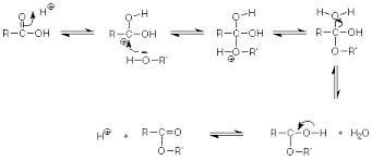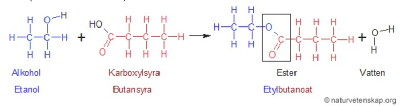 Jag håller på och lär mig om vad Estrar är. Jag kollar på reaktionen ovan och förstår den inte tyvärr! :( Det jag inte fattar är var det blåa vätet, H, tagit vägen i etanolen när reaktionen ägt rum? Det svartmarkerade H blev vatten, ja, men det blåa H längst ut till höger?
