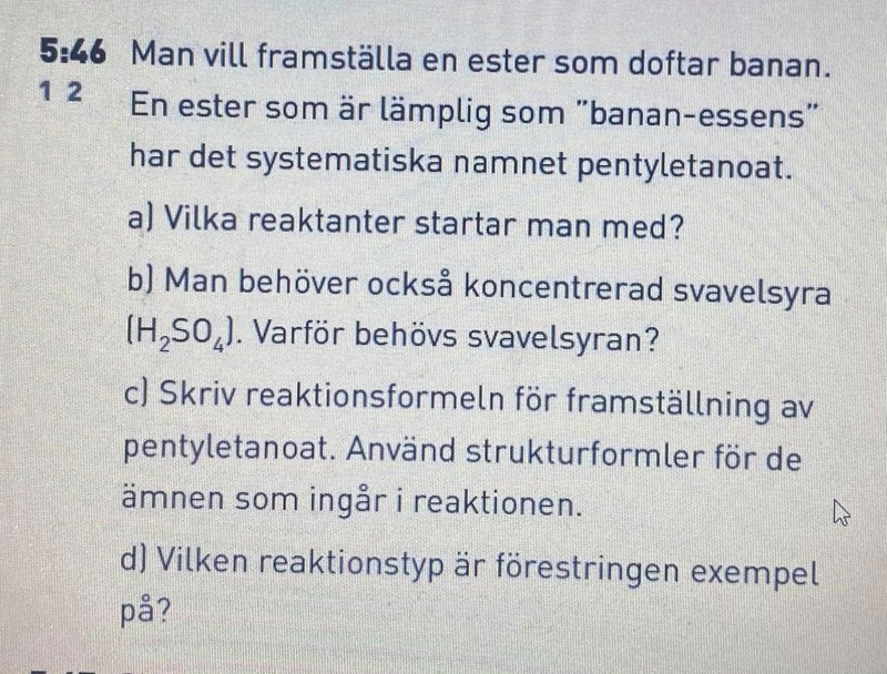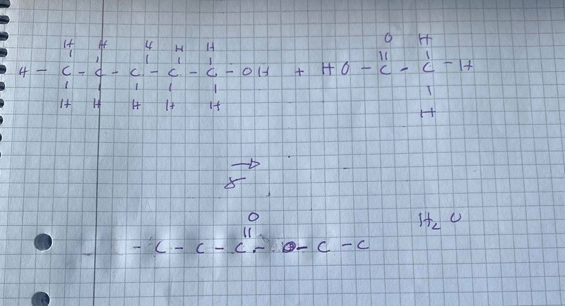 Jag har fastnat lite på c uppgiften, där jag har gjort följande, men vet inte riktigt om det är korrekt och om jag tänkt rätt, vore tacksam för hjälp (glömde + tecken mellan vatten och estern)