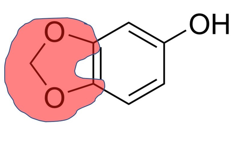 det här är sesamol. Räknas dem två syrena till vänster som etrar eller inte? För syrerna sitter ju på en fenolgrupp, vilket i för sig är uppbyggt av kolväten, men det är ju inte en vanlig kolvätekedja.