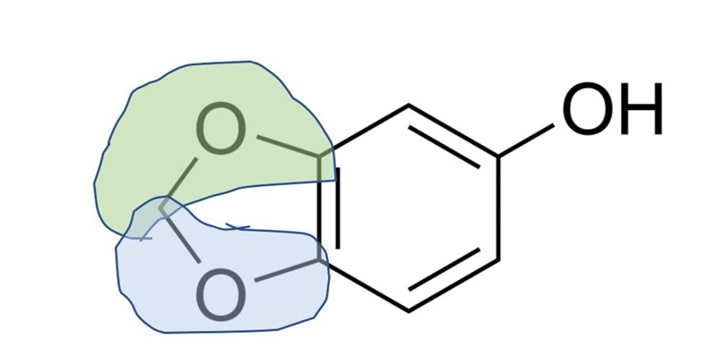 I sesamol motsvaras de två eterenheterna av den gröna respektive den blåa delen:
