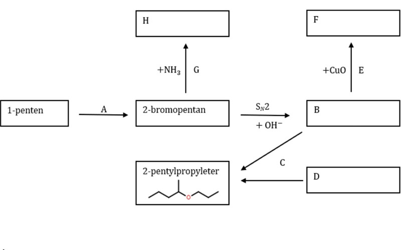 Flödesschemat är lite otydligt där B och D reagerar. Jag misstänker "C" står med för att indikera att något mer sker. Du skall m.a.o. lista ut vad "C" är, t.ex. den lämnande gruppen är under substitutionsreaktionen.