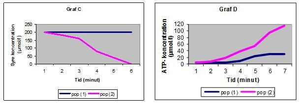 I ett annat experiment undersöktes två olika populationer jästsvampar: en population jästsvampar som saknade mitokondrier (pop 1) och en population med jästsvampar som hade mitokondrier (pop 2). Syrekoncentrationen och ATP-koncentrationen mättes under hela experimentet.