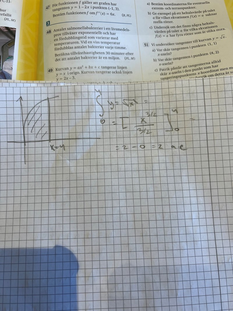 DSGIS86 skrev:Ett område begränsas av kurvan y = √x, x-axeln och linjen x = 4.