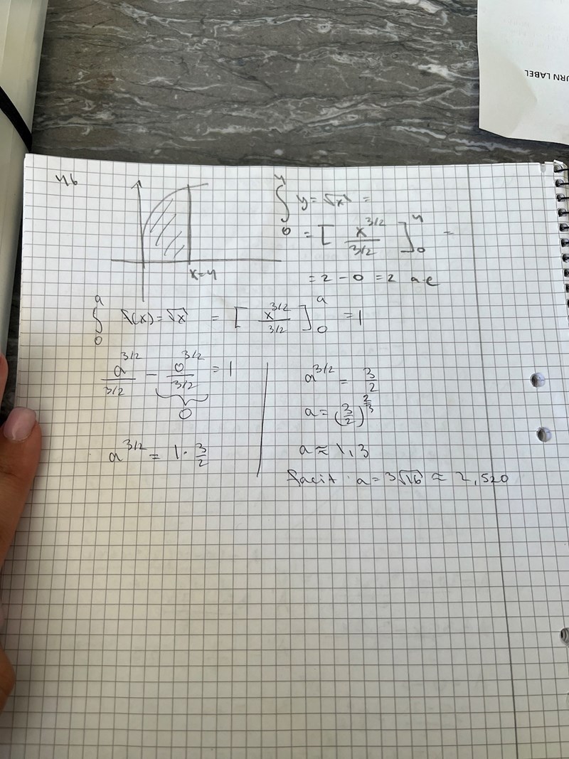 Jag tänkte först räkna ut arean med hjälp av integralen för funktionen y är lika med roten ur x dx men har inte kommit längre