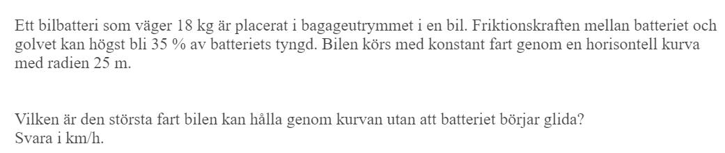 Hej, jag undrar varför man sätter F_my=F_c. Jag antar att när man räknar på den här uppgiften så antar man att bilen är vid den högsta punkten på kurvan. Jag har ritar en bild på en kurva, är det en sådan de menar? För att i sådana fall så verkar ju F_c rakt nedåt och F_my verkar vinkelrät mot kurvan, alltså även vinkelrät mot F_c. Då kan man väl inte sätta dessa lika med varandra eftersom de verkar i olika dimentioner? Eller antar man att bilen är vid sidan av kurvan?