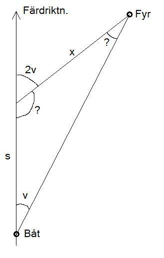 Ture skrev:Om du tittar på triangeln som bildas mellan de två pejlingslinjerna och vägen båten har åkt, är det några vinklar i den som är lika?