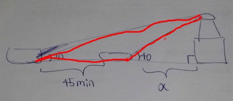 jag ritade en figur och fick fram två trianglar, den andra triangeln(som bildas vid andra pejlingen) har vinklarna 40,90 och 50 grader så kom jag fram till att när en av vinklarna dvs 50 graders vinkeln blir 0 så är fartyget framme. Och man man vet att det tar 45 minuter innan 2 graders vinkeln ökar med 20 grader, då blir vinklarna 60,90 och 30. Och så fortsätter jag lägga på 20 grader till den andra vinkeln blir 0.