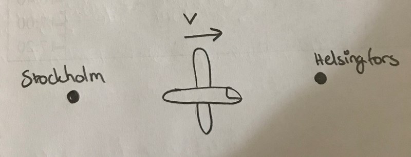 Ett flygplan flyger från Stockholm mot Helsingfors. Jordens magnetfält inducerar en spänning på 0,36 V mellan vingspetsarna på flygplanet. Planet åker i 900 km/h och det är 30m mellan vingspetsarna.