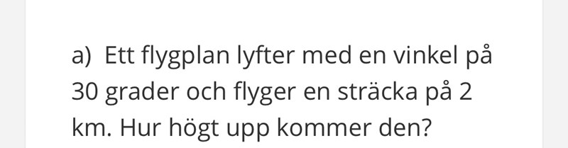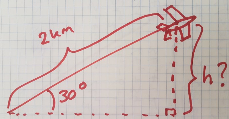 Det finns ett rigonometriskt samband som knyter ihop vinkeln 30° med höjden (motstående katet) h och flygsträckan (hypotenusan) 2 km.