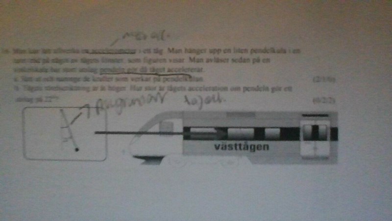 Man kan lätt tillverka en accelerometer i ett tåg. Man hänger upp en liten pendelkula i en tunn tråd på något av tågets fönster. Man avläser sedan på en vinkelskala hur stort utslag pendeln gör då tåget accelererar. Tågets rörelseriktning är åt höger. Hur stor är tågets acceleration om pendeln gör ett utslag på 22 grader? (texten är samma som på min bild, jag tänkte dock att ni kanske ville se figuren)