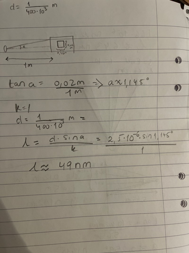 Jag löste frågan på ett annat sätt men vet ej om det är rätt. Jag antog att k=1 . Att vinkeln a beräknas mha tangens och använde formeln d*sin a = k*lamda