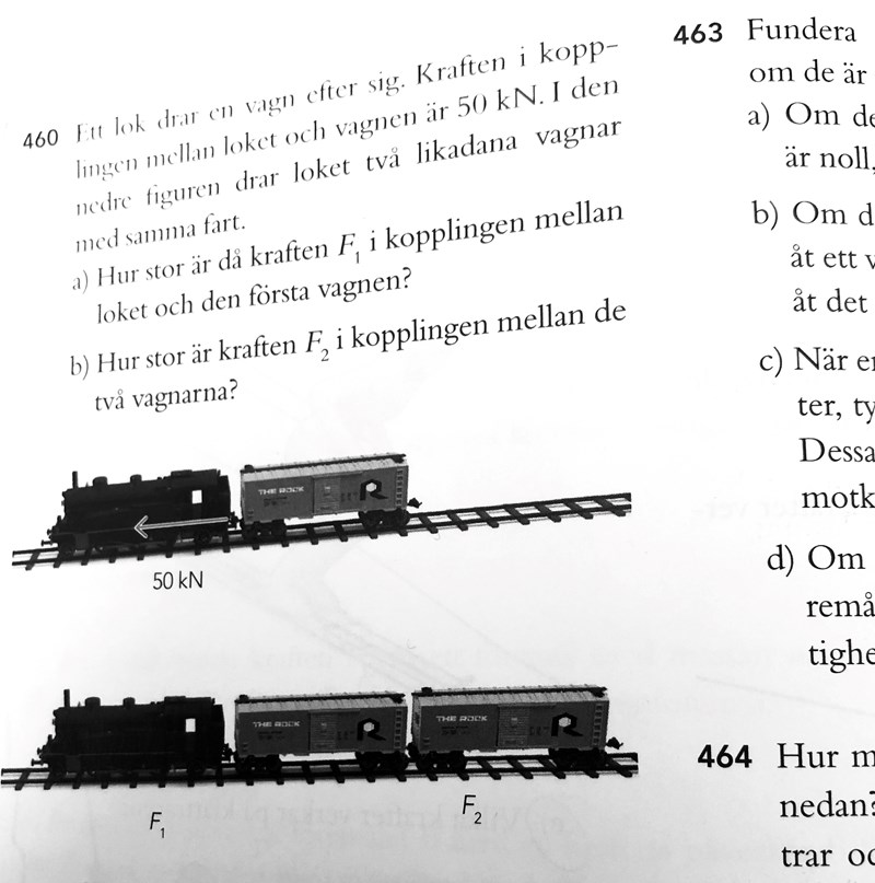 I a uppgiften) Så drar loket vagnen med 50kNenligt bilden. Det måste betyda att den vagnen i sin tur även kommer att dra vagnen som är efter med 50kN. Svaret borde vara 50kN men i facit står det 100kN vilket jag inte förstår.