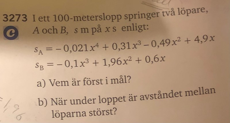 Jag förstår att jag ska ta funktionen B minus A för att hitta en skillnad mellan de, i och med att funktionen beskriver själva sträckan i meter.