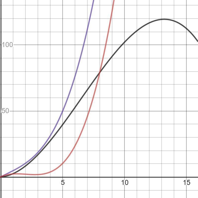 Sedan när linjen går uppåt och passerar x-axeln är de två funktionerna lika. Typ som efter lite mer än 3s, då har de båda löparna kommit lika långt. Så om du tar x-värdet där den här vågiga linjen korsar x-axeln och stoppar in det i de båda funktionerna från uppgiften har de samma y-värde för det x-värdet.